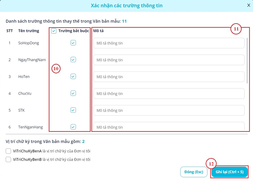 Bước 7: Sau khi bấm Ghi lại, hệ thống hiển thị giao diện Xác nhận các trường thông tin, tại giao diện mới này Bạn tick chọn vào các biến số bắt buộc phải nhập của hồ sơ (10). Cuối cùng bạn nhập mô tả cho các biến số (11) và bấm Ghi lại (12) để hoàn tất (Khi tạo hồ sơ, mô tả sẽ hiển thị dưới textbox nhập giá trị biến số).