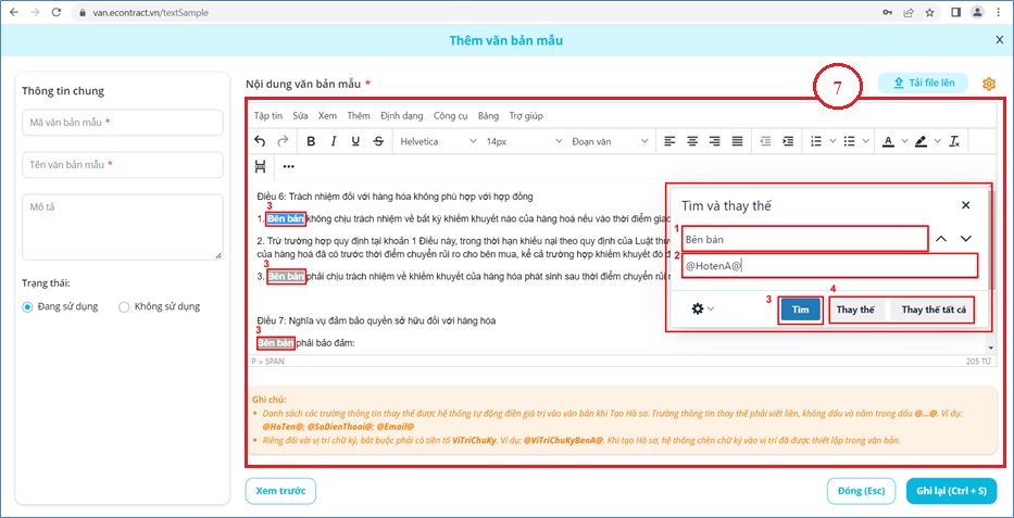 - Để tìm nhanh các vị trí cùng nội dung và thay bằng biến số, Bạn đặt con trỏ chuột tại khung soạn thảo và bấm Ctrl+F, hệ thống sẽ mở ra cửa sổ Tìm và Thay thế