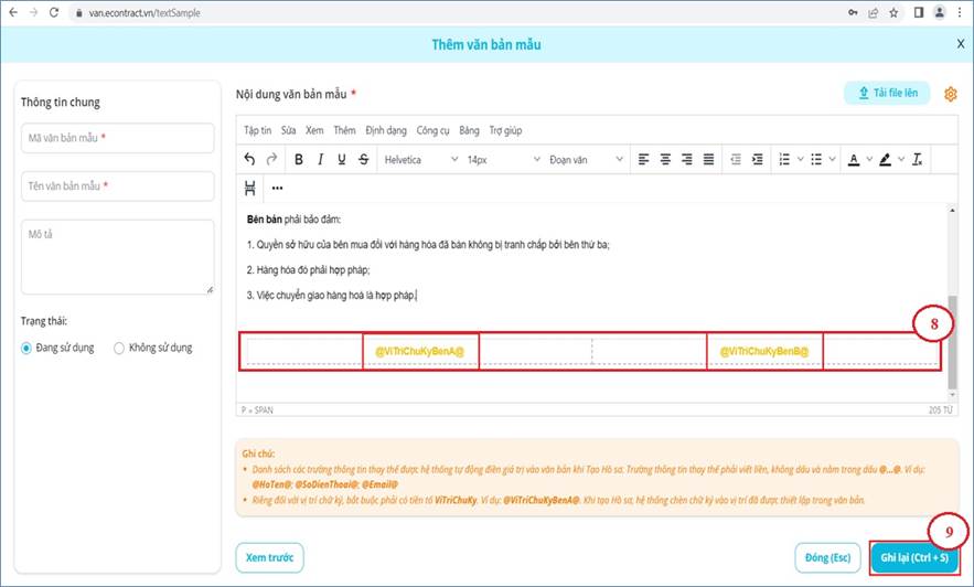 Bước 6: Sau khi tạo các biến số, Bạn tạo vị trí cho các chữ ký (8) theo hướng dẫn trong Ghi chú (Chữ ký có dạng “@ViTriChuKy…@” Trong đó ViTriChuKy phải đúng ký tự viết hoa và viết thường). Sau khi tạo xong bấm Ghi lại (9)