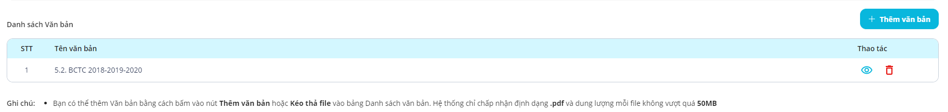 - Sau khi thêm, hệ thống hiển thị văn bản được thêm tại Danh sách văn bản: