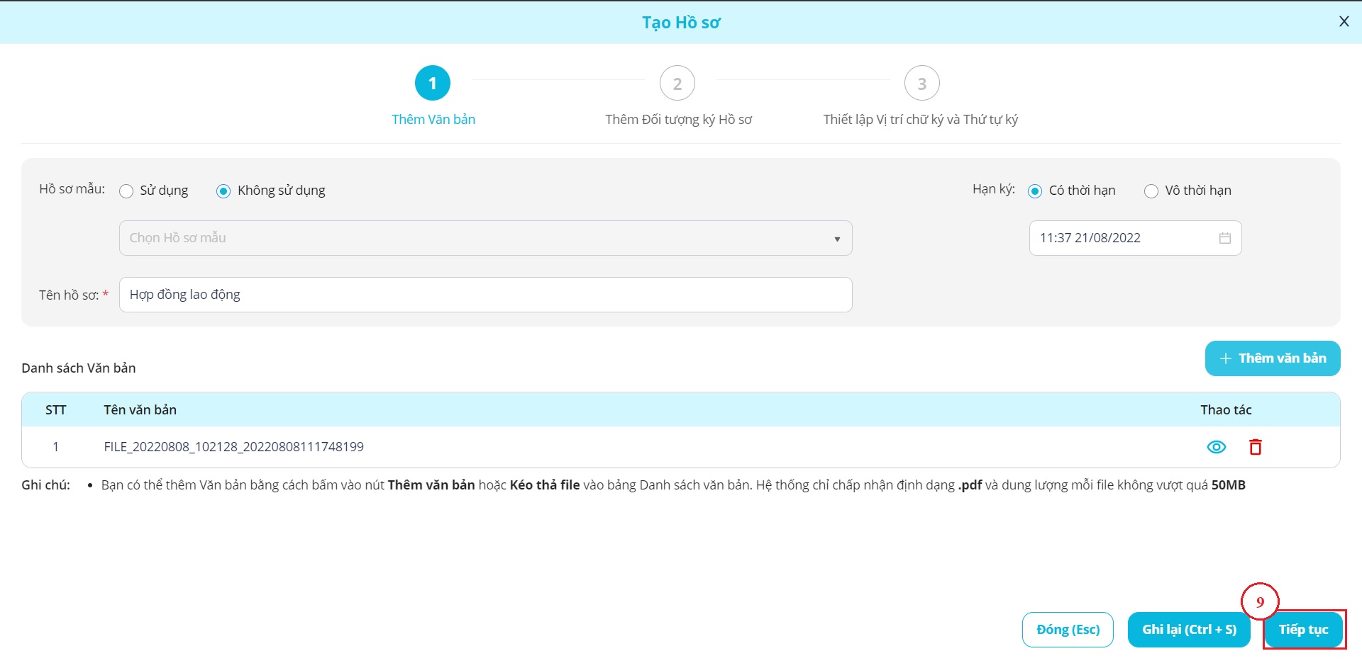 để xóa bỏ văn bản đã thêm. - Khi hoàn tất việc thêm văn bản bạn bấm Tiếp tục (9) để chuyển sang bước tiếp theo: