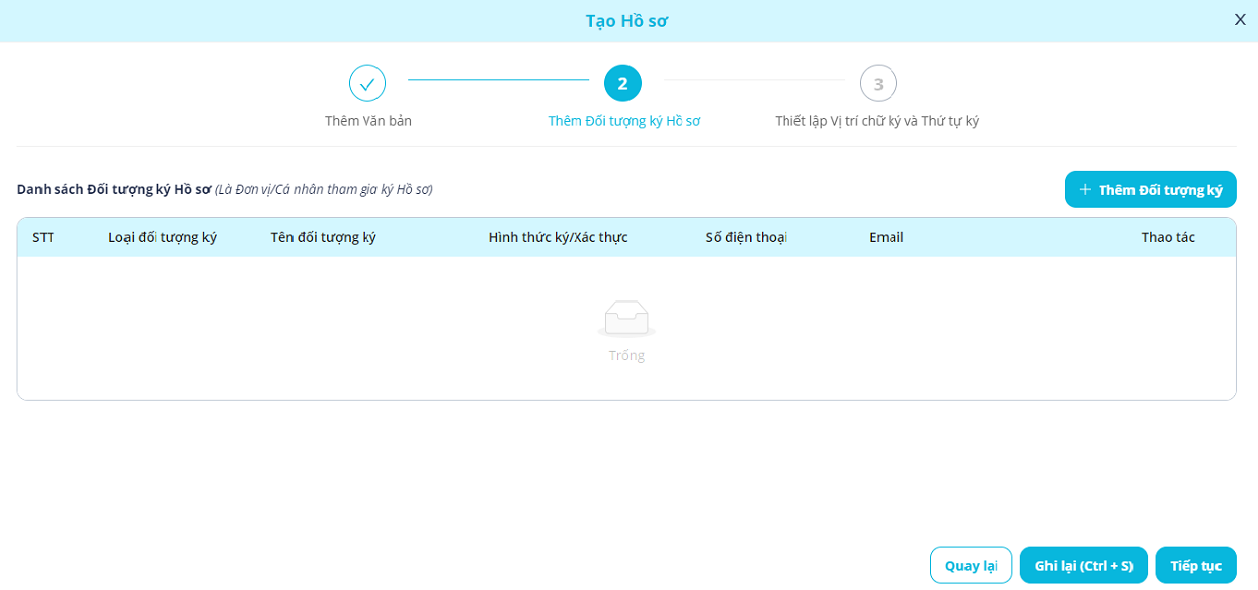 Bước 4: Sau khi bấm Tiếp tục hệ thống chuyển sang giao diện Tạo Hồ sơ – Thêm Đối tượng ký hồ sơ.