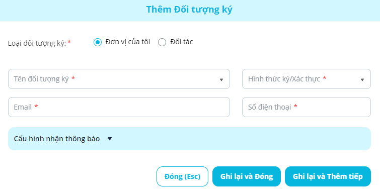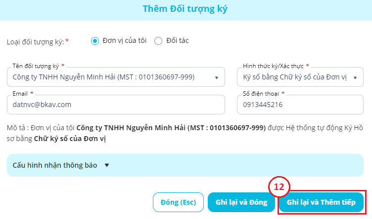 - Bấm Ghi lại và thêm tiếp (12), đối tượng vừa Ghi lại sẽ được thêm vào danh sách đối tượng ký, đồng thời hệ thống hiển thị giao diện cho thêm Đối tượng ký tiếp theo: