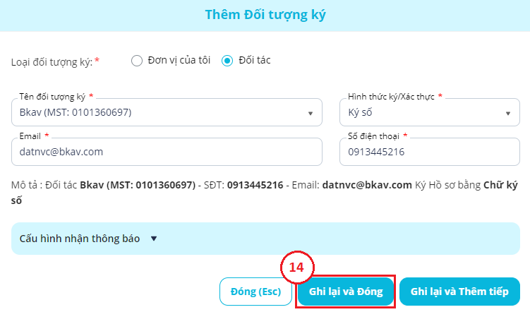 - Để hoàn tất việc Thêm đối tượng ký, Bạn chọn Ghi lại và Đóng (14).