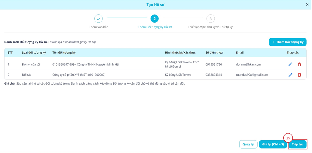 - Sau khi đã thiết lập xong thông tin các Đối tượng ký, Bạn có thể sắp xếp lại thứ tự Chữ ký theo thứ tự Bạn mong muốn, rồi bấm Tiếp tục (15) để hoàn tất.