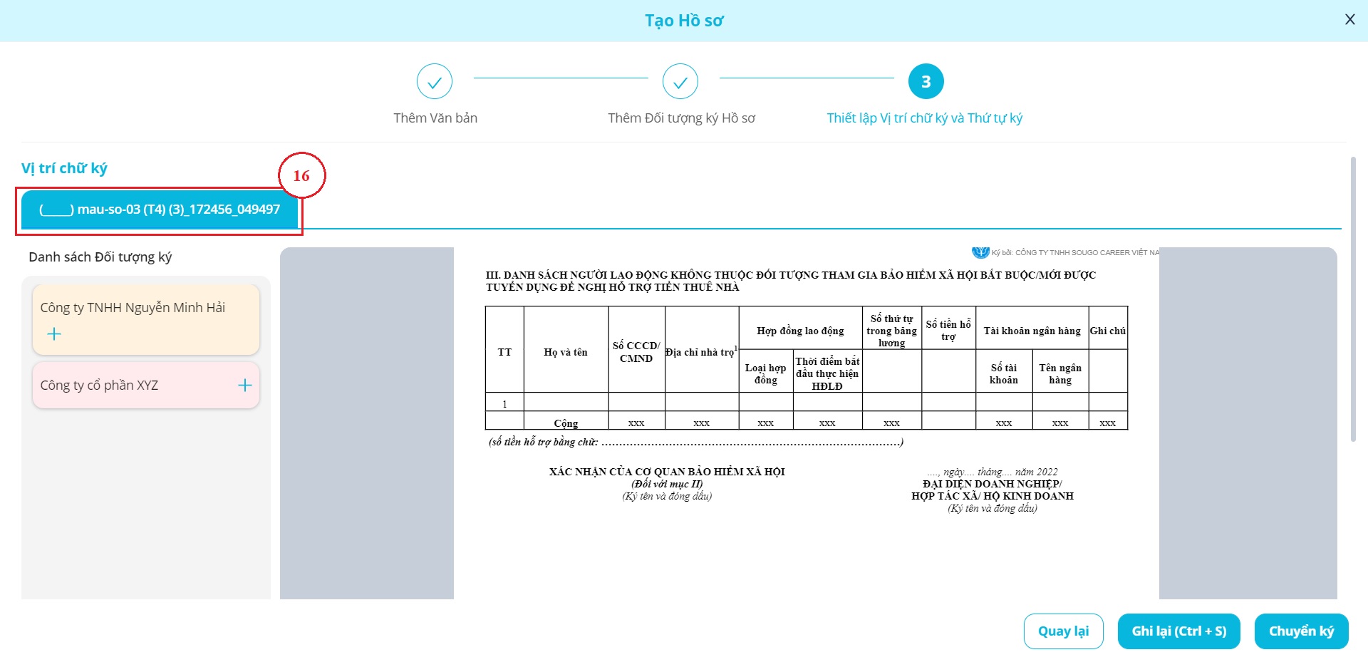 - Bạn chọn văn bản cần xem và thiết lập chữ ký (16). Lúc này hệ thống tự điền chữ ký vào các vị trí theo thứ tự đã thêm.