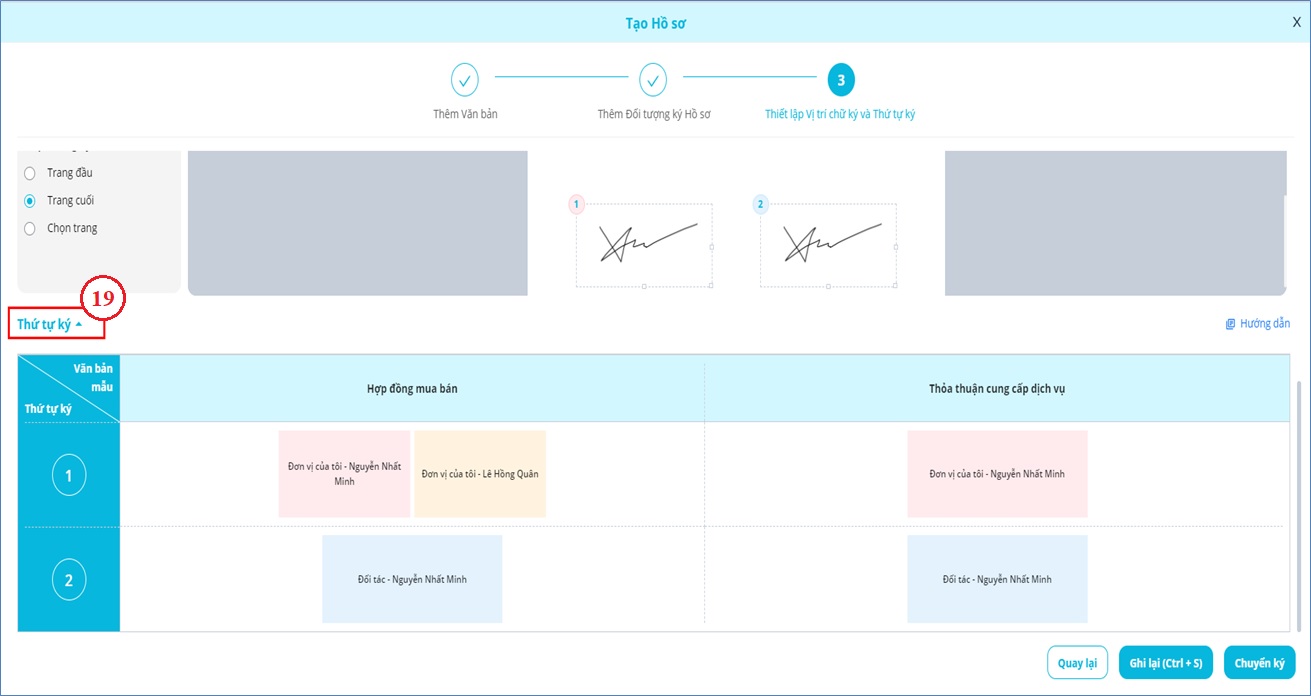 - Mỗi dòng Thứ tự ký tương ứng với một lượt ký. Để đảm bảo người ký chỉ cần ký một lần văn bản, trong một số trường hợp bạn sẽ cần sắp xếp lại các thứ tự ký.