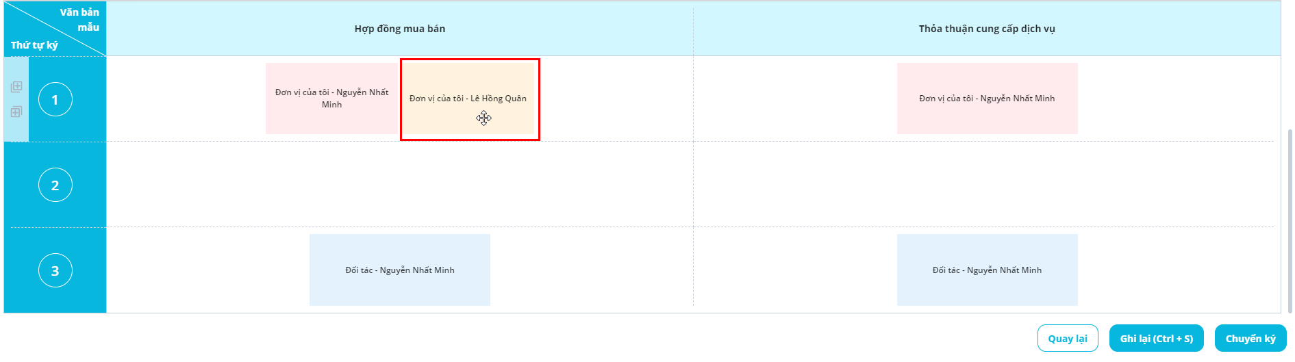 - Di chuyển chuột vào chữ ký cần thay đổi thứ tự ký. Sau đó giữ và kéo thả vào dòng tương ứng của Thứ tự ký mong muốn: