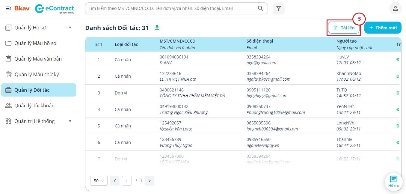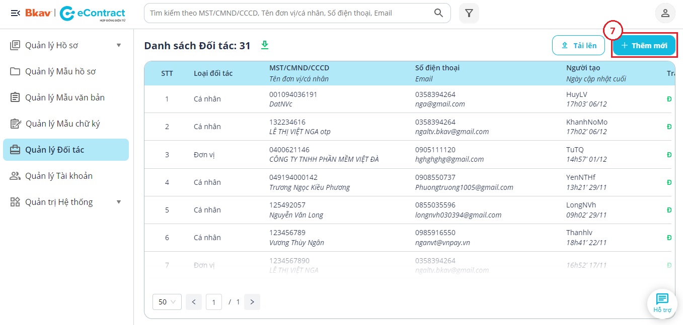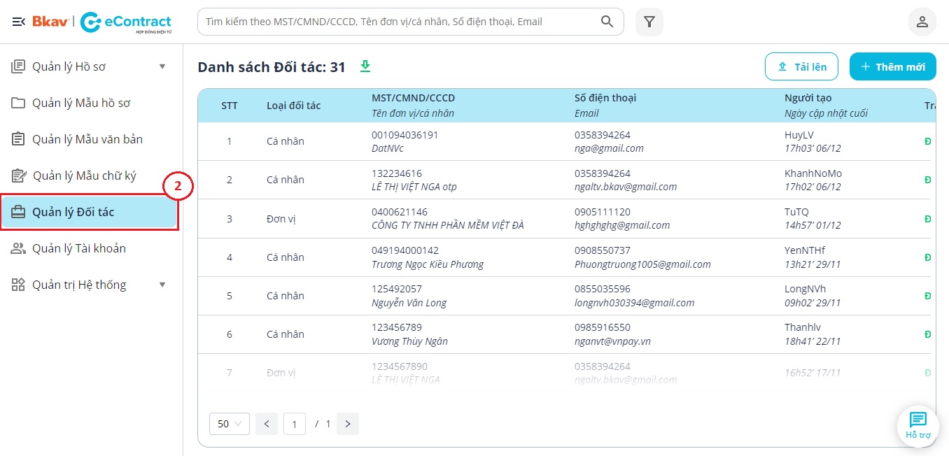 Như vậy Bạn đã hoàn thành việc cập nhật danh sách đối tác lên Nền tảng Bkav eContract.