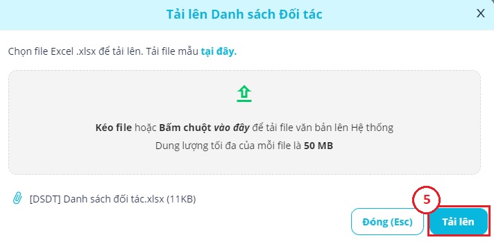 - Tại giao diện “Tải lên Danh sách Đối tác” Bạn chọn file excel vừa cập nhật và bấm “Tải lên” (5)