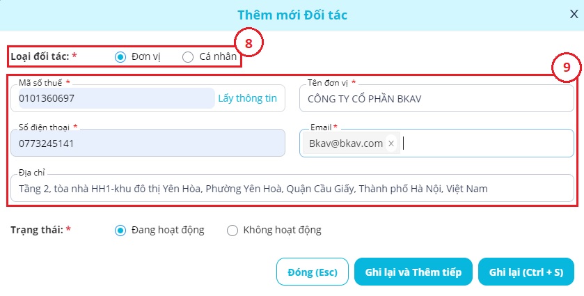 - Nền tảng hiển thị giao diện “Thêm mới Đối tác” Bạn chọn “Loại Đối tác” là Cá nhân hay Đợn vị (8) và nhập thông tin tương ứng (9)