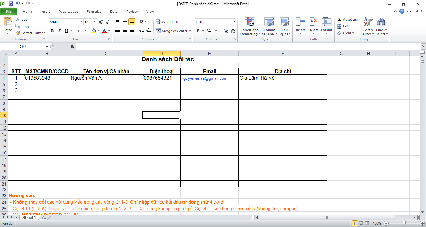 - Sau khi tải file excel Bạn cập nhật các trường thông tin của đối tác vào file mẫu.
